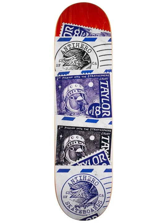 Skate into the stratosphere on the Anti Hero Taylor Postal Deck 8.38 x 32.25. This is a pro quality skateboard deck constructed from traditional 7-ply maple wood with background stains that could be different than what is pictured. FREE griptape is available with the purchase of the deck.