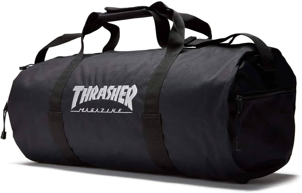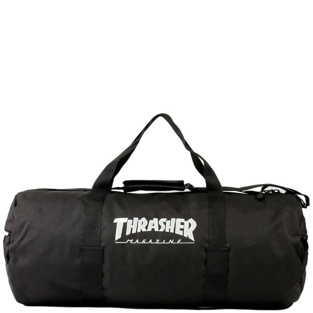 A Thrasher Mag branded duffel bag in black.