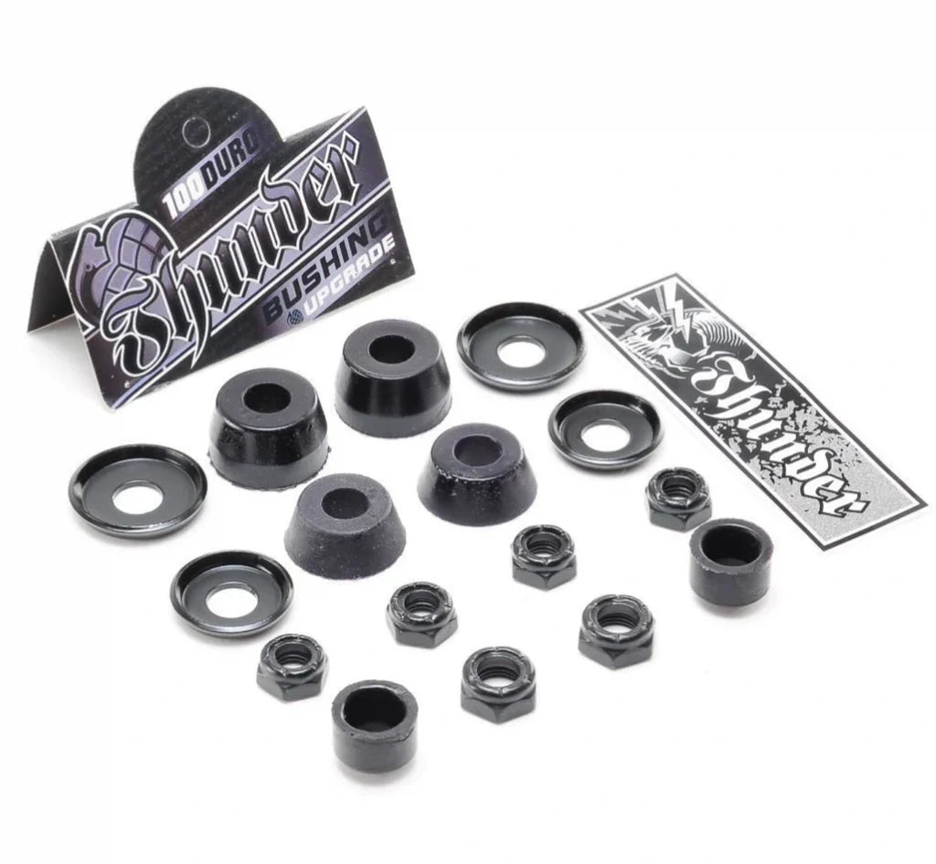 The Thunder Bushing Rebuild Kit, team designed and team tested. This set comes complete with Bushings, washers, pivot cups, axle nuts, and kingpin nuts. This set is for both trucks. This kit comes with an upgrade of: High rebound urethane top and bottom bushings set Tempered and plated steel bushing washers Axle nuts and kingpin nuts High density urethane pivot cup